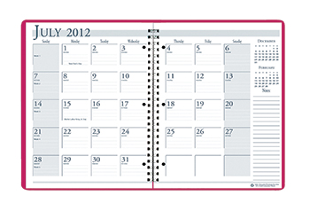 - Page size 8 1/2" x 11" - 14 months, July - August - One month per two-page spread - Block size: 1 3/4" x 1 3/4" - Two-piece leatherette cover - Three-hole punched to fit standard three-ring binder - Dark Pink cover |