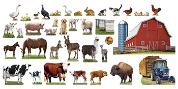 Present a variety of farm animals with realistic photos of animal moms and babies. 17 pairs of animals include Holstein cows, cats, horses, pigs, sheep, chickens, turkeys, rabbits, dogs, geese, Hereford cows, ducks, donkeys, llamas, goats, bison, and bees. 37-piece set also includes a tractor plus a 26" W x 15" H barn and silo, with a barn door and hayloft that open. Ideal for teaching: Pre-Kindergarten to 3rd Grade Ages 3 to 9 |
