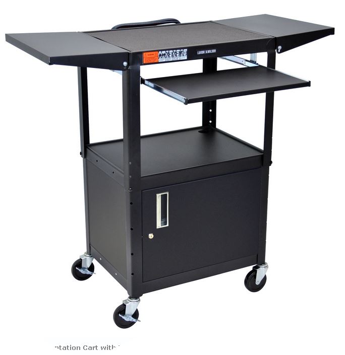Adjustable Steel AV Cart w/ Cabinet, Keyboard Shelf & Drop Leaf Shelves The Adjustable Presentation Cart with Drop Leaf Shelves is an excellent multipurpose AV / Utility Carts. 24"W X 18"D X 24"-42"H. Adjustable height from 24" to 42" in 2" increments. Shelves are 24"W x 18"D. Roll formed shelves with powder coat paint finish. Tables are robotically welded. Cables pass through holes. 1/4" retaining lip around each shelf. 3-outlet, 15' UL and CSA listed electrical assembly with cord plug snap. 4" ball bearing casters, two with locking brakes.Includes safety mats. This is an adjustable height cart with Cabinet, Keyboard and mouse shelf with 2 drop leaf shelves. Keyboard Tray Measures: 18 3/4" x 11 3/4". The Cabinet model has reinforced locking doors with full length piano hinges and is made from 20 gauge steel with inner dimensions 17 1/2'D x 24"W x 16 5/8"H. The drop leaf shelves measure 11"W x 18"D. Built to last with a lifetime warranty. Made in USA |