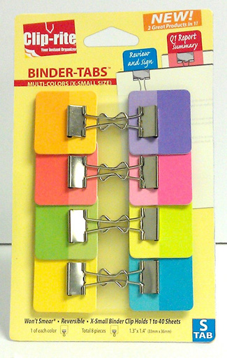 Clip-rite™ Binder-Tabs™ are a great new tool to get you quickly organized by clipping, color coordinating and highlighting important information that you may need at your fingertips. It is writable, reusable, reversible, and recyclable. It holds up to 40 sheets of paper and the tab is extra durable. (WITH X SMALL CLIPS) |