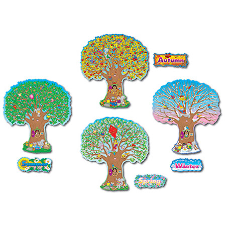 Included are 4 seasonal trees, each approx. 25" tall; 4 coordinating headers; and a resource guide.