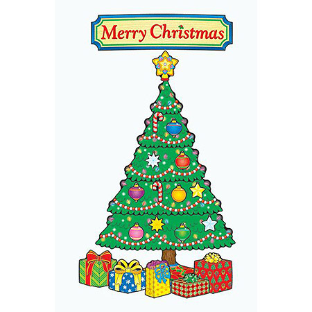 Tree dimensions are approx. 20" x 32" when assembled with 18 ornaments, 12 stars, 6 candy canes, 5 presents, a tree topper, and a header. Resource guide included, with reproducible Thinking Tags to stimulate creative thought and writing.