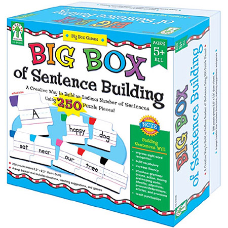 Improve sight word recognition, build vocabulary, increase fluency, teach punctuation, and introduce grammar with the Big Box of Sentence Building! The 250 puzzle pieces (approx. 2" x 2") also include four blank puzzle pieces that can be used with write-on/wipe-off crayons or dry erase markers. The pieces are also color-coded by the part of speech it represents. Also included is a 4-page booklet with directions, teaching suggestions, and games. Games include Scrambled Sentences, Spinner Game, and much more. Supports NCTE standards.