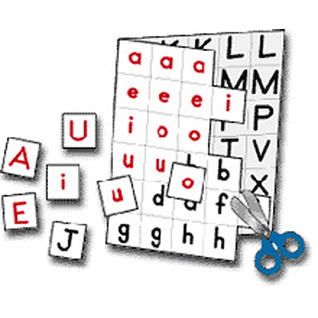 12 student sets of cut-apart letter cards. Four of each vowel and two of each consonant per set, with lowercase letters on one side and uppercase on the other.