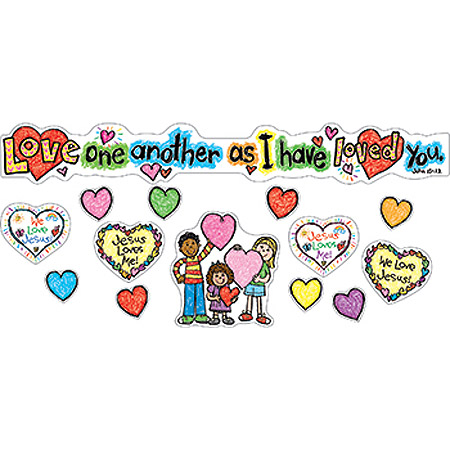 Banner dimensions are approx. 40.5" x 5.5" when assembled with kids holding hearts accent piece, 4 big hearts, 18 small hearts, and an activity guide.