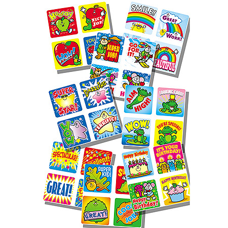 The Motivational Kit includes: CD-0601 Apples, CD-0613 Fall Fun, CD-0630 School Days: Kid-Drawn, CD-0639 Stars, CD-0617 Frogs, CD-0632 Smile Fun, CD-0635 Snowmen, and CD-0625 Positive Words. Each package in this kit contains (120) 1" x 1" acid-free and lignin-free stickers.