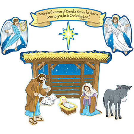 Stable dimensions are approx. 15.25" x 9.25" assembled. Set also contains 10 characters, 4 animals, a star, a Luke 2:11 header, and an activity guide.
