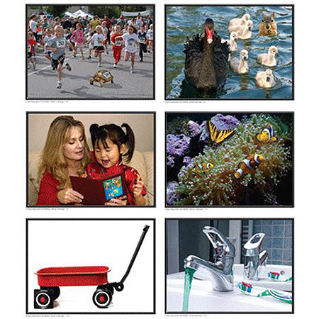 48 cards, 4.25 " x 5.5" each, featuring photographs showing "silly" scenes or things as well as a resource guide and word lists in English, Spanish, and French . Builds expressive language skills and increases vocabulary. Great conversation starters. Supports NCTE and NAEYC standards. |