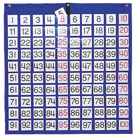 100 pockets, each 2in. wide. Cards from 0-100 with multiples of 2, 3, 5, and 10, each highlighted with different colors. 26in. x 26in.