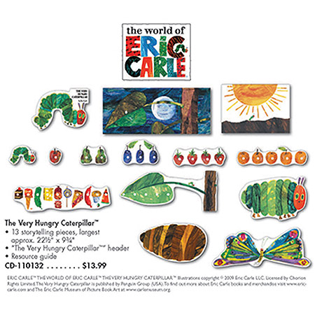 Set includes 13 storytelling pieces, largest approx. 22.5" x 9.75", "The Very Hungry Caterpillar™" header, and a resource guide. ™ & © 2009 Eric Carle LLC. Licensed by Chorion Rights Limited.