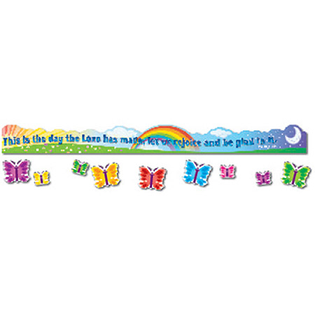 Banner dimensions are approx. 60.5" x 5.75" when assembled with 9 large butterflies, 12 small butterflies, and an activity guide.
