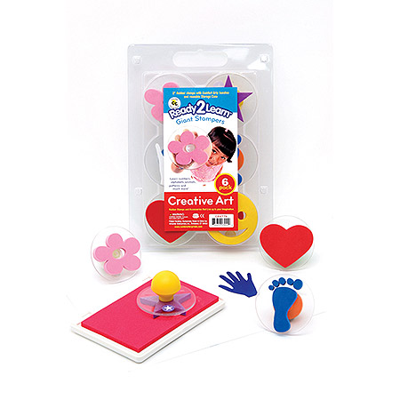 Ideal for use with paint or ink pads, each foam stamp is 3" in diameter and mounted on a clear see-through top for easy, exact placement. Stamps also have a directional arrow for perfect alignment. Stamps and comfort-grip handles are color-coded for easy sorting and storage. Ready2Learn™ Giant Stampers are a great way to stamp out your own posters, wrapping paper and signs. Set of 6 includes a flower, star, hand, foot, heart and smile face. Includes reusable, clear plastic storage case. Stamp pad sold separately.
