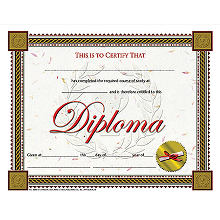 Our Diplomas, Certificates and Awards are 8.5" x 11" in size with beautiful, authentic designs printed in full color on high quality paper. They are sold in lots of 30. Order now so you won't be disappointed later. Certificate reads: This Is To Certify That _________ has completed the required course of study at _______ and is therefore entitled to this Diploma Given at _______ this ______ day of _______ year of _______
