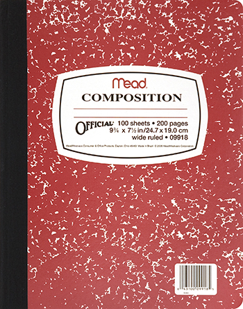Great colors on an old favorite! This reliable comp book is offered in red, green, purple and blue. Wide ruled, white paper 100 Ct Class Schedule on inside front cover Multiplication table, coversion table and grammar rules on inside back cover Durable cover with secure sewn binding FORMAT:Undated PAGE SIZE:7 1/2" x 9 3/4" SIZE:7 1/2" x 9 3/4" x 3/8" RULING:Wide BINDING:Stitched STYLE:Composition Book |
