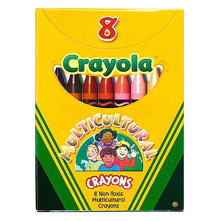 Crayola® Crayons provide true color, no piling, build up, or erasing of crayon layers — good lay down. Tip and barrel strong, durable, long lasting and economical. Double-wrapped for added strength with the color name on the label. Multicultural regular size crayons measure 3-5/8" x 5/16" and are available in an assortment of realistic skin tones and hues; great for projects on diversity and self-awareness in a tuck box. Non-toxic, AP Seal.8 multicultural colors