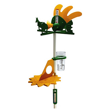 Young students make observations about sunlight, rainfall, wind and temperature with this rugged beginning weather station. All components are attached to one central pole that can be put in the ground or a flower pot outside the classroom window. Measures wind direction and speed, temperature, rainfall and time. Approximately 48" high.
