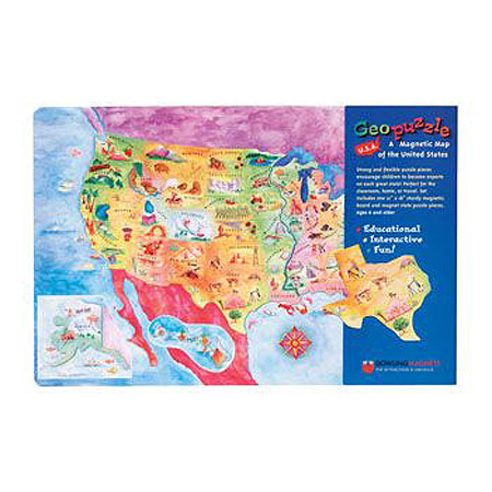 Geography can be fun and attractive too! Play at home, school or on the road.This magnetic puzzle of the United States encourages learning with beautiful magnet state pieces! Children have fun discovering the wonder US geography while learning about locations, natural wonders and capitals. State puzzle pieces stick securely to the double-sided magnetic 12 x 18" playboard. The set comes complete with an activity sheet loaded with fun facts and state-by-state information. Geo Puzzle is conveniently packed in a reusable vinyl envelope.