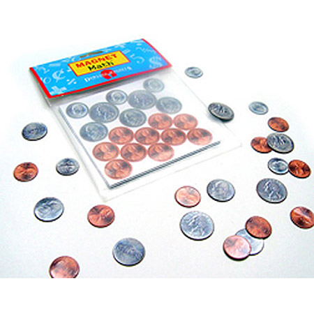 Introduce coins, their denominations, and how to make change with these magnetic coins. Coins are evenly split between both heads and tails. 8 quarters 12 dimes 12 nickels 40 pennies