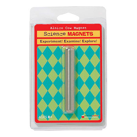 This 3" long cylindrical magnet is world famous! There's one inside every cow! You can do all kinds of cool things with a cow magnet, but cow magnets were originally used as a tool to save the lives of cows, which eat everything from grass and dirt to nails, staples and bits of bailing wire (referred to as tramp iron). A cow has 4 compartments in its stomach, and when these tramp iron items work their way through, they cause all kinds of problems, threatening the surrounding vital organs and causing irritation and inflammation, and worse. When a cow swallows a cow magnet, it lands in the first compartment of the stomach, and attracts the stray metal on its way by, holding it in a safe place.