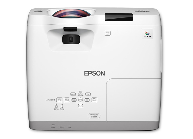 ackage Includes: - PowerLite 525W WXGA 3LCD Projector - Power Cord - Computer Cable (VGA) - Projector Remote Control - Batteries - User Manual CD - Lens Cover - Quick Setup Sheet - Projector Software CD - Password Protection Sticker Bring engaging widescreen lessons to any classroom with the affordable PowerLite 525W short-throw projector. Delivering 3x Brighter Colors than competitive models, Epson 3LCD projectors ensure vibrant images. Featuring 2800 lumens of color brightness and 2800 lumens of white brightness, the 525W shines - even in ambient light. Optimized for small spaces, it projects images up to 116" from 4' away with minimal shadows or glare. Low-cost, long-lasting lamps offer a low total cost of ownership. An optional wall mount provides flexible installation. Moderator device management software allows instructors to wirelessly share students' work from multiple devices, simultaneously - including computers, iOS and Android devices. Features: - Standard Mode Brightness: 2800 lm - Projection Method: Front, Rear, Ceiling -Limited Warranty: 2 Years - Contrast Ratio: 16,000:1 - Normal Mode Lamp Life: 5,000 hours - Output Scan Format: 720p - Dimensions: 13.5" W x 12.4" D x 5.2" H -Green Compliance Certificate/Authority: RoHS - Economy Mode Lamp Life: 10,000 hours - Operating Power Consumption: 292 W - USB: Yes - Green Compliant: Yes - Maximum Resolution: 1600 x 1200 - Weight (approx.): 9 lbs. - Lamp Type: UHE - Graphic Mode: WXGA - HDMI: Yes - Native Resolution: 1280 x 800 - Video Signal Standard: HDTV - Lamp Power: 215 W - Native Aspect Ratio: 16:10 - Maximum Diagonal Image Size: 116" - Number of Lamps: 1 - Maximum Focal Length: 6.40 mm |
