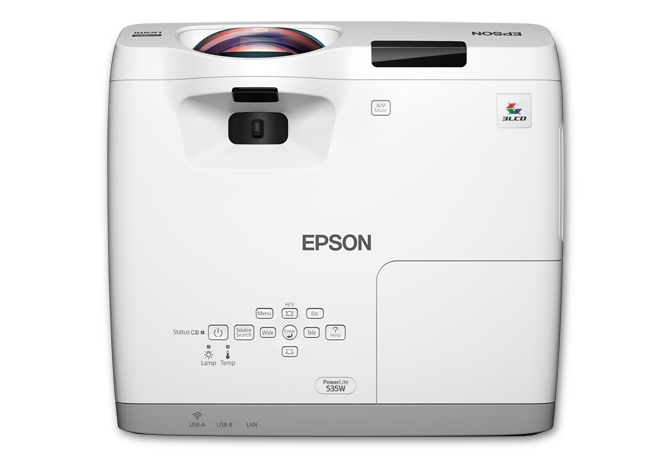 ackage Includes: - PowerLite 535W WXGA 3LCD Projector - Power Cord - Computer Cable (VGA) - Projector Remote Control - Batteries - User Manual CD - Lens Cover - Quick Setup Sheet - Projector Software CD - Password Protection Sticker Featuring ultra bright widescreen performance, the easy-to-use PowerLite 535W short-throw projector offers engaging classroom lessons. Delivering 3x Brighter Colors than competitive models, Epson 3LCD projectors ensure vibrant images. Featuring 3400 lumens of color brightness and 3400 lumens of white brightness, the 535W shines - even in sunny rooms. Project images up to 116" from 4' away with minimal shadows or glare. Utilizing low-cost, long-lasting lamps, this reliable performer provides a low total cost of ownership. It also features flexible installation. Plus, Moderator device management software allows instructors to wirelessly share students' work from multiple devices, simultaneously - including computers, iOS and Android devices. Features: - Standard Mode Brightness: 3400 lm - Projection Method: Front, Rear, Ceiling - Limited Warranty: 2 Years - Contrast Ratio: 16,000:1 - Normal Mode Lamp Life: 5,000 hours - Output Scan Format: 720p - Dimensions: 13.5" W x 12.4" D x 5.2" H - Green Compliance Certificate/Authority: RoHS - Economy Mode Lamp Life: 10,000 hours - Operating Power Consumption: 315 W - USB: Yes - Green Compliant: Yes - Maximum Resolution: 1600 x 1200 - Weight (approx.): 9 lbs. - Lamp Type: UHE - Graphic Mode: WXGA - HDMI: Yes - Native Resolution: 1280 x 800 - Video Signal Standard: HDTV - Lamp Power: 215 W - Native Aspect Ratio: 16:10 - Maximum Diagonal Image Size: 116" - Number of Lamps: 1 - Maximum Focal Length: 6.40 mm |