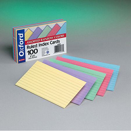 Durable card stock. Quality engineered with precision cuts for uniform size. 3x5, Ruled one side. 100 cards/pack. Assorted in Blue, Violet, Canary, Green, Cherry.
