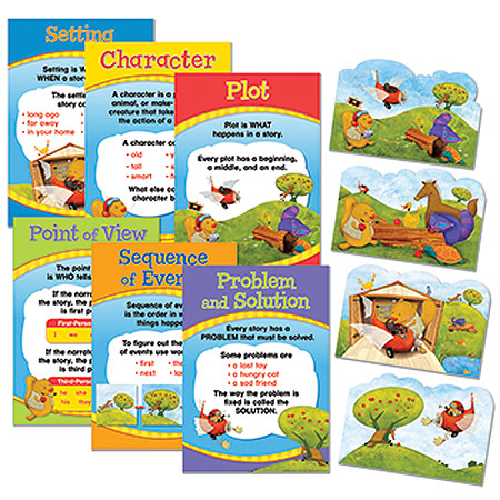 This set is designed to introduce students to the elements of a story: setting, main characters, main events, sequence and problems. Contains 6 posters and 4 die-cut illustrations. Aligns with MCREL Standards for language arts. Level 1