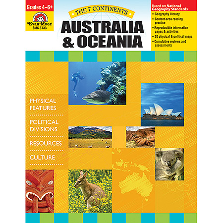 The 7 Continents: Australia and Oceania helps students learn about Australia and Oceania through engaging reading and writing activities. Five geography units cover the following standards-based topics: Section 1: Australia and Oceania in the World Introduces students to the location of Australia and Oceania in the world. Australia and Oceania's Relative Location Australia and Oceania's Hemispheres Australia and Oceania's Absolute Location Using a Projection Map Section 2: Political Divisions of Australia and Oceania Introduces students to the four regions and 14 countries of Australia and Oceania. Population of Australia and Oceania Countries of Australia and Oceania Largest Countries by Area Smallest Countries by Area Largest Countries by Population Dependent Territories Australia Melanesia Micronesia Polynesia Capital Cities Section 3: Physical Features of Australia and Oceania Students learn about the landforms and bodies of water of Australia and Oceania. Landscape of Australia and Oceania Deserts of Australia Ayers Rock The Great Barrier Reef Islands of Oceania Mountain Ranges Rainforests Bodies of Water New Zealand's Fjords Australia's Lakes Australia's Rivers Section 4: Valuable Resources of Australia and Oceania Students learn about the various natural resources of Australia and Oceania. Coal in Australia Hydroelectricity in New Zealand Mining Metals and Minerals Agriculture in Australia Sheep Farming Fishing in Oceania Oceania Tourism Unique Wildlife Section 5: Australia and Oceanian Culture Introduces students to the beliefs and traditions of the people of Australia and Oceania. Tourist Attractions Arts and Entertainment Major Religions Native Cultures Cuisine Celebrations |
