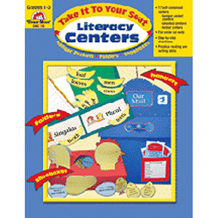 There are a multitude of great reasons why every primary teacher should have this book:, you don't need a special center area, the centers are easy to store for future use, you can make them ahead of time (terrific projects for parents to do), you can individualize skill practice, the centers are just plain CUTE Here are the center topics and the skills practiced: Hanger Pocket Centers, Mailbox—write a letter, Pencil--handwriting practice, Clown--write a story, Kangaroo--read a poem, Dog--categories Shoebox Centers, Birdhouse--descriptive paragraphs, Bear--support the topic sentence, Chicken--riddles, Elephant--compound words, Leaf & Caterpillar--synonyms, Flower--rhyming Folder Centers, Penguins--antonyms, Trucks--building words, Monkeys--singular & plural, Rabbit--super sentences, Trains--alphabetical order, Dogs--real or make-believe?