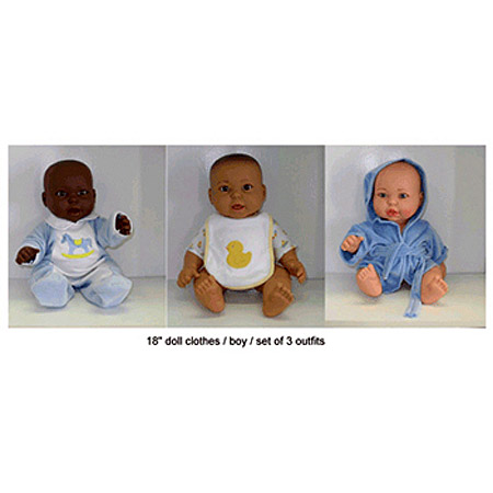 Specifically tailored to 18" baby dolls. Three blue outfits include: sleeper, onesie with bib, and robe. Grade: Toddler, PreK, K-3 |