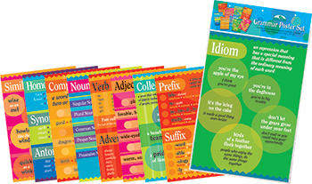 Help your students learn about grammar by displaying our beautiful grammar posters throughout the classroom! Children will love the eye-catching design and simple explanations of grammar functions. Set includes Collective Noun, Verb/Adverb, Noun, Simile, Prefix/Suffix, Idiom, Compound Word Adjective, and Homophone/Synonym/Antonym. These posters provide an easy way to help students memorize these grammar functions through striking visuals and clear examples. |