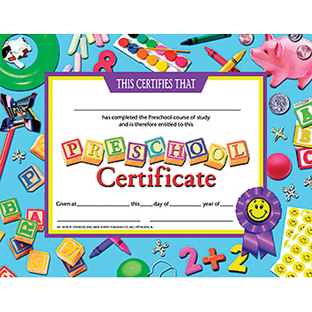 Our Diplomas, Certificates and Awards are 8.5" x 11" in size with beautiful, authentic designs printed in full color on high quality paper. They are sold in lots of 30. Order now so you won't be disappointed later. Certificate reads: This certifies that ______ has completed the Preschool course of study and is therefore entitled to this Preschool Certificate. Given at _____ this _____ day of ________ year of ______