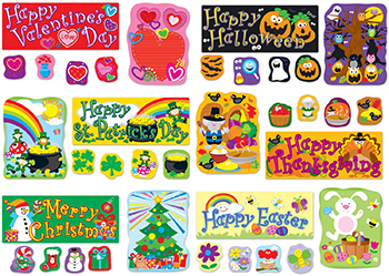 Bring the holidays back into the classroom with this compact bulletin board set that includes six major holidays: Valentine's Day, Easter, St. Patrick's Day, Halloween, Thanksgiving, and Christmas! · (6) 8.5" x 11" holiday scenes · 36 large accents (six for each holiday) · 24 small accents (four for each holiday) · 6 holiday headers: Happy Valentine's Day, Happy St. Patrick's Day, Happy Easter, Happy Halloween, Happy Thanksgiving, Merry Christmas |