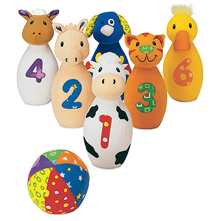 Award winning Baby Farm Friends Bowling is a set of 6 soft fabric, adorable, farm animal bowling pins and a bright multi-patterned ball. Perfect for holding, carrying, hugging and knocking down these animals are numbered from 1-6 with large contrasting fabric numerals. Featuring flat bottoms and distinctive chiming sounds Baby Farm Friends bowling is perfect for little ones.