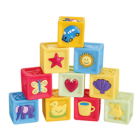 - 10 soft phthalate-free vinyl blocks that squeak when you squeeze them - Each block features two brightly colored images and 4 raised pictures for sensory stimulation - Raised edges are easy to grasp and stack |