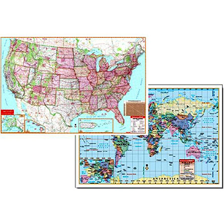 The US/World Advanced Physical Laminated Rolled Map displays the Mercator Projection and offers complete coverage, including an inset of Europe. Physical maps show wetlands, desert locations, ocean currents, and water depths plus includes an elevation cross —section with color bar