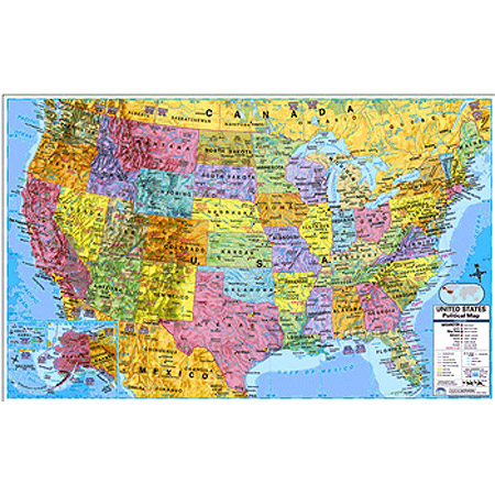 This United States and World Wall Map by Universal map is a laminated 2 for 1 special. The World map features Robinson Projection and measures 40" W x 28 " H. The US map features the Continental United States, Alaska and Hawaii with an inset map of Puerto Rico. Lamination provides durability for the map and the ability to mark on and wipe off with an erasable marker.