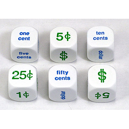 Package of 6 20mmdice. Contains 3 U.S. dollar and cents dice and 3 dice with corresponding money words in English
