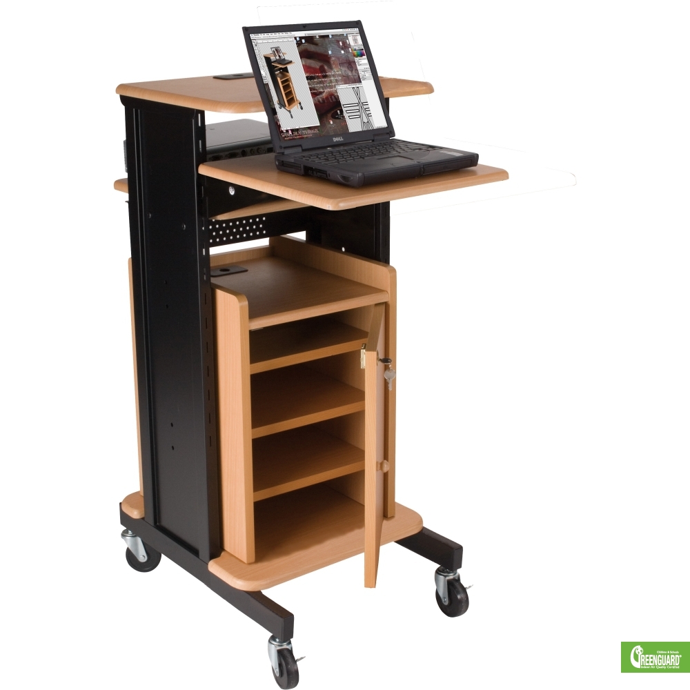 Laptop Caddy Presentation Cart w/ Cabinet Ideal for any meeting room, training room, or other AV presentation environment, this presentation cart comes standard with four shelves to hold your equipment at just the right height. Constructed with a black powder-coated 18-gauge steel frame for superior support and durability, the handy unit rolls anywhere it is needed on 3" casters (two locking). Available in gray or teak scratch-resistant laminate shelves constructed with a durable and moisture-resistant MDF core. Includes a locking cabinet. The top shelf and laptop shelf each measure 18"W x 14"D. Laptop shelf is adjustable in height from 19" to 39.5" to accommodate either a standing or sitting user. Bottom shelf measures 18"W x 18"D. Each shelf features a grommet for easy cable management. Overall dimensions: 40.25"H x 18"W x 30"D. Weight: 46 lbs. Ships UPS. |