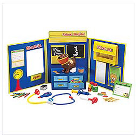 For students who love animals, this animal hospital is just what the doctor ordered. Role play encourages students to practice oral language and writing skills while learning about the responsibilities of caring for pets. Sturdy, tri-fold board with built-in storage pockets allows quick and secure clean-up. Includes a brown puppy to care for. Comprehensive set features everything a veterinarian needs to keep pets healthy and happy. Set measures 38"L x 16"H when open.