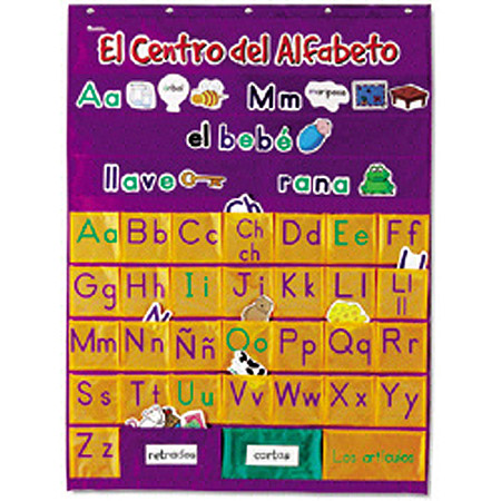 Spanish Alphabet Pocket Chart (El Centro del Alfabeto) This unique chart uses pictures and color-coded letters to introduce and reinforce letter recognition, spelling, sounds and beginning words. Durable, easy-to-clean nylon chart features three clear pocket rows for card display. Measures 37.75 in H x 28.25in W.