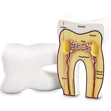 Show students what's beneath the surface of their own teeth with this 5" foam cross-section model. 2-part model is labeled on one side with the main parts of a tooth: enamel, dentin, pulp, cementum, nerves, blood vessels, root and crown. The other half is labeled with letters for assessment. Included Activity Guide features facts about teeth, dental hygiene and related activities.