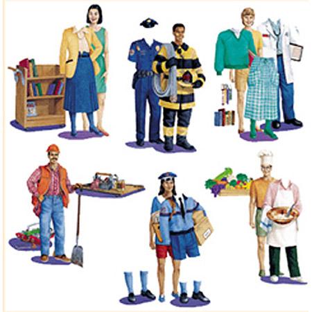 Includes 3 men and 3 women representing 4 ethnic groups, 22 careers, plus a uniform and lesson guide. Figures stand 10 inch tall. 45 pieces. Grade Level: PreK-1 |