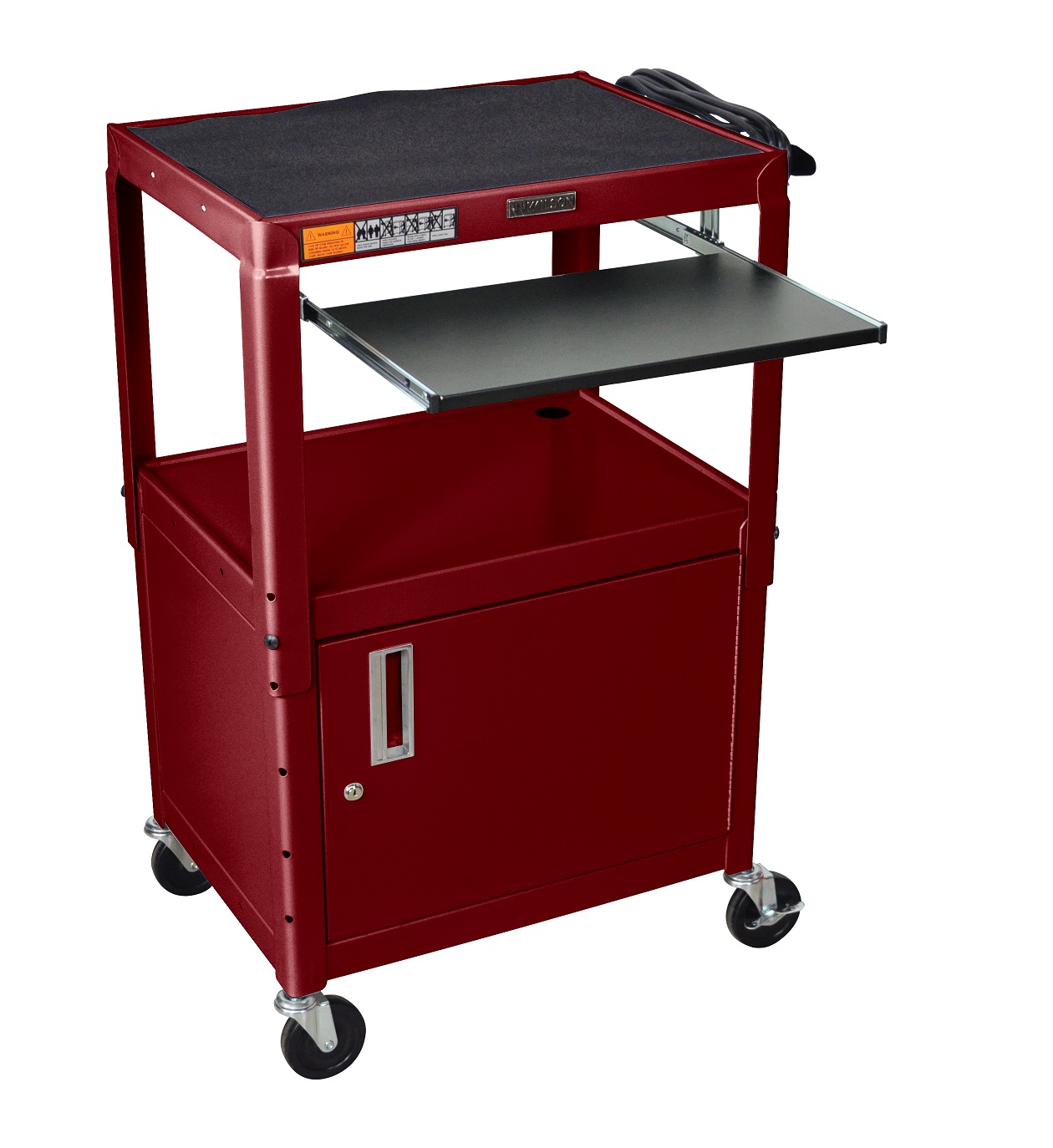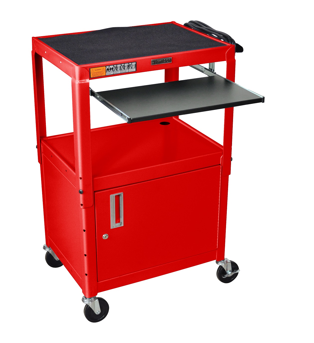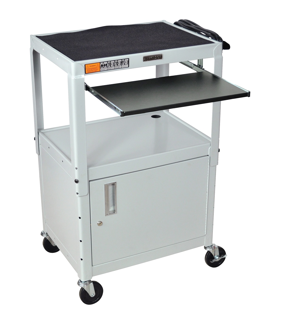 The Adjustable Presentation Cart with Pull-out Shelf is an excellent multipurpose AV / Utility Cart. 24"W X 18"D X 24"- 42"H Adjustable height from 24" to 42" in 2" increments. Shelves are 24"W x 18"D Roll formed shelves with powder coat paint finish. Tables are robotically welded.Cables pass through holes.1/4" retaining lip around each shelf. 3-outlet, 15' UL and CSA listed electrical assembly with cord plug snap. 4" ball bearing casters, two with locking brakes. Includes safety mats. Includes cabinet and keyboard & mouse shelf. Keyboard Tray Measures: 18 3/4" x 11 3/4". The Cabinet has reinforced locking doors with full length piano hinges and is made from 20 gauge steel with inner dimensions 17 1/2'D x 24"W x 16 5/8"H. Built to last with a lifetime warranty. Made in USA |