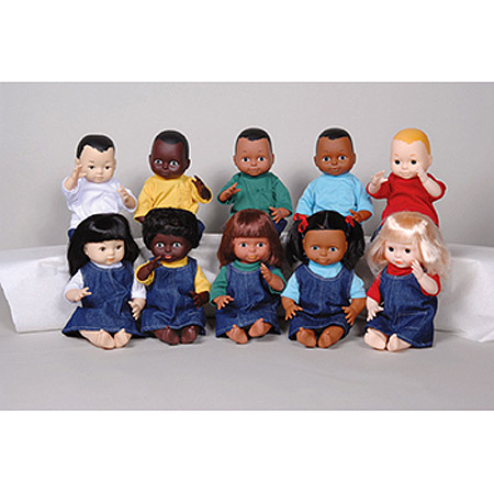 This realistic playmate is designed to encourage identification and positive self-concept. This all-vinyl doll has accurate ethnic features and coloring. The doll is 13" with moveable arms, legs, and head. She has beautiful, rooted hair. All eyes are painted on for safety. Being made of vinyl, she is squeezable, durable, and washable. All outfits are removable for extra play value in learning dressing skills.