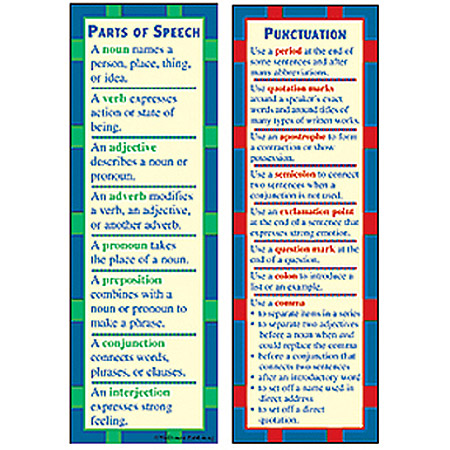 This handy two-sided bookmark defines the eight parts of speech and explains the main uses of periods, quotation marks, apostrophes, semicolons, exclamation points, question marks, colons, and commas. 36 bookmarks per package.