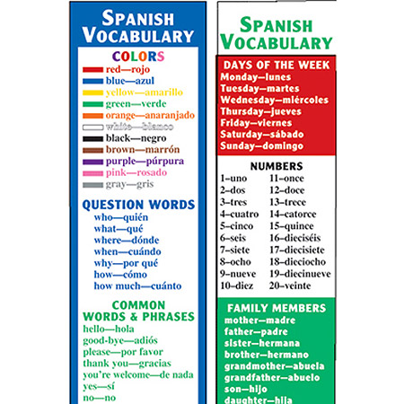 This colorful two-sided bookmark reviews basic Spanish vocabulary, including colors, question words, days of the week, numbers, family members, and common words and phrases. 36 bookmarks per package.