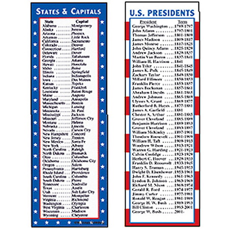 One side of this bright bookmark lists the 50 states and their capitals. The other side lists the U.S. presidents and their years in office. 36 bookmarks per package.