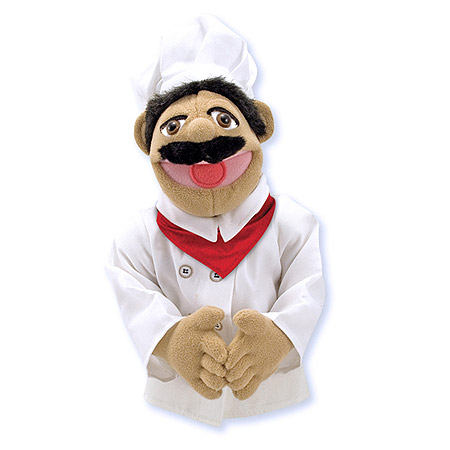 What's for dinner? Just ask Chef Alfredo 'Al' Dente for the special of the day! Use one hand to manipulate the puppet's mouth and facial expressions while gesturing with the removable wooden rod with the other. Detachable rod is suitable for lefties or righties!
