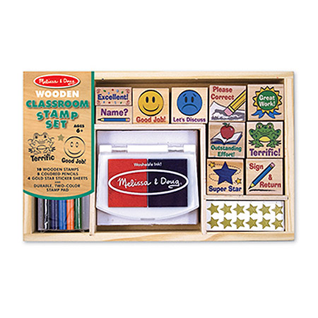 Whether you're a real teacher or a teacher-in-training, this stamp set has everything you need to make your mark! Ten wooden stamps, five colored pencils, a two-color ink pad and lots of gold star stickers will help all your students go to the head of the class. Washable, non-toxic kid-friendly ink.